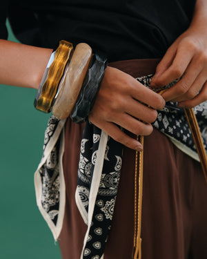 These sculptural formica bangles bring major art-gallery energy, with bold faceted edges and moody, marbled tones. Wear them stacked for instant cool-girl confidence — or let one shine solo when you’re in your minimalist era.