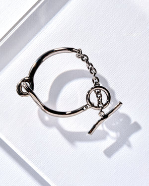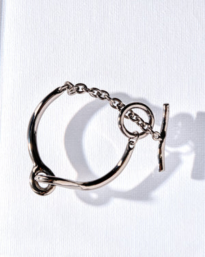 This gunmetal black bracelet features a overlapping circle design at the center with a toggle clasp. Simple and edgy, this makes a great addition to any ensemble.