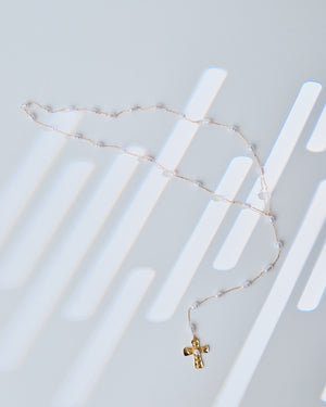 This elegant rosary-style necklace pairs luminous pearl beads with a 16K gold-plated cross charm, giving classic devotion a touch of luxe flair. It’s the perfect piece for adding a little heavenly glow to your everyday style.