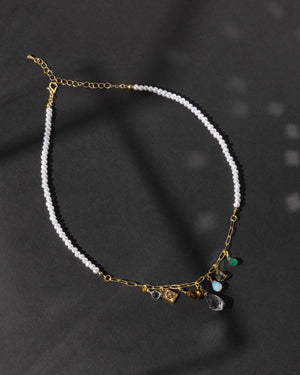This dual-tone charm necklace mixes pearls, gold links, and colorful glass drops for that effortlessly artsy vibe. Perfect for days when you want your accessories to look like they’ve been collected from adventures.
