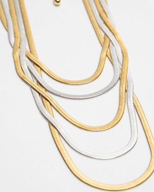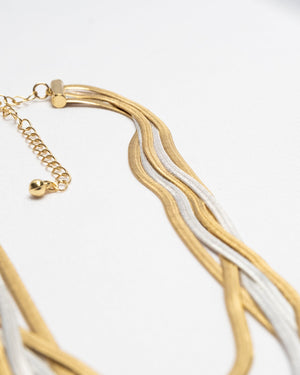 Turn heads with this striking five-layered chain necklace, where silky snake chains shimmer in alternating waves of 16K rose and white gold. It's the ultimate statement piece—bold, radiant, and ready to elevate every outfit.