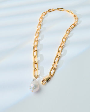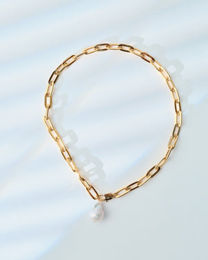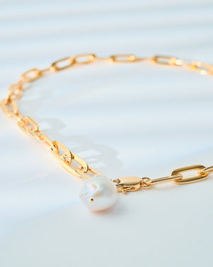This chunky link necklace with a bold pearl pendant is where edgy meets elegant in the most unexpected way. Perfect for when you want your accessories to be classy but at the same time a bit bold!