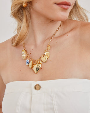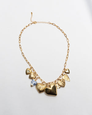 Wear your heart(s) on your necklace with this full of love 16K gold plated necklace, adorned with nine uniquely designed heart-shaped charms—each with its own personality, from mirror-shine and hammered finishes to sparkling zirconia and a pop of stunning formica. It’s a love letter in jewelry form, made to charm at every angle.