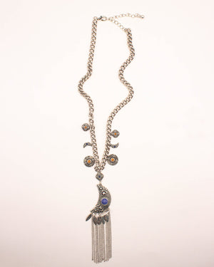 Bold and intricate, the River Necklace is made for making statements. This antique-inspired piece features a chunky silver-tone chain adorned with engraved sunburst medallions and crescent charms, anchored by a sculptural pendant with a deep blue stone. Fringe chain tassels and engraved leaf drops add drama and movement. Whether you’re pairing it with a simple tee or layered over prints, this one brings major energy.