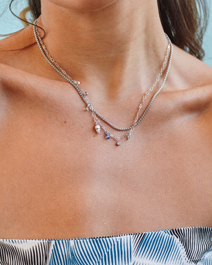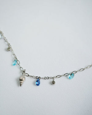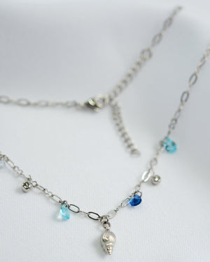 Get a touch of the ocean this gorgeous, charm adorned necklace. Featuring stunning blue beads and a shell pendant at the center, this silver tone necklace is a beauty.
