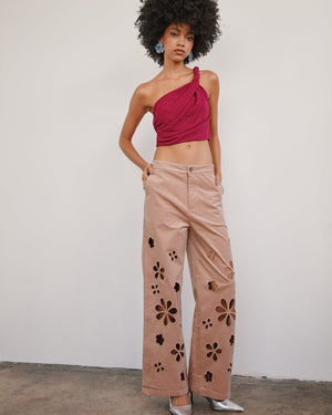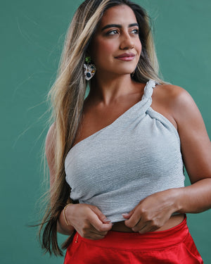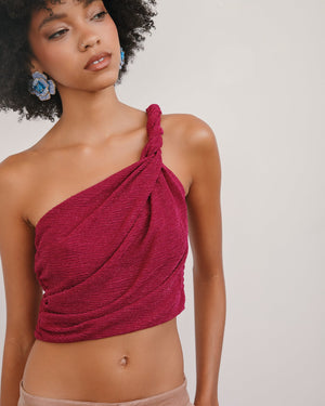 This one-shoulder crop top brings effortless party energy with its sleek sheen and twist detail. Flirty, bold, and ready to steal the spotlight — no extra styling required.