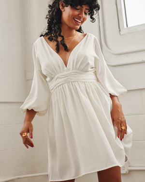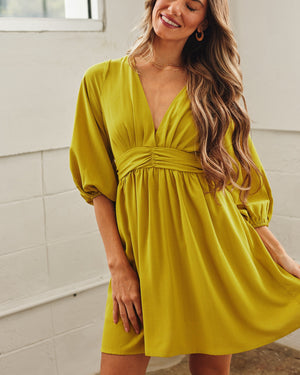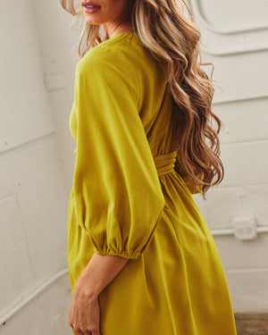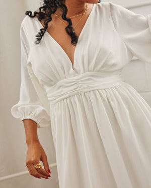 Serve up some serious elegance in this midi dress with a V-neck, long balloon sleeves, and a front pleated design that’s all about that luxe life. Style it with strappy heels and statement earrings for a look that slays!