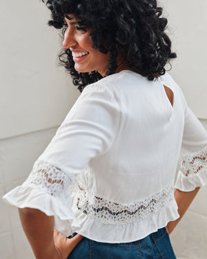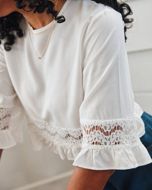 This adorable crop features a lovely ladder lace design with ruffle, 3/4 length sleeves. Coming in a classic white, this staple piece is one you simply must have.