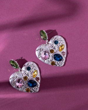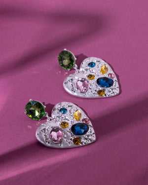 These playful heart-shaped drop earrings sparkle with a kaleidoscope of glass crystals, catching the light from every angle. Bold, colorful, and impossible to ignore, they’re your go-to pair when your outfit needs a little extra wow.