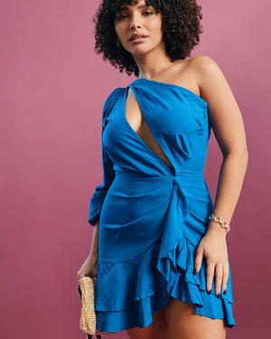 This electric mini dress brings all the drama with its bold one-shoulder neckline, daring front cutout, and flouncy layered hem. Finished with a single billowy sleeve and a flirty, asymmetrical silhouette, it’s the perfect piece for nights when you want all eyes on you.