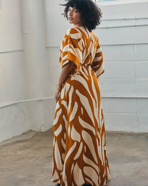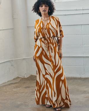 This breezy maxi dress brings effortless glamour with its bold print and relaxed kimono-style sleeves. Finished with a drawstring waist and tassel ties, it’s the perfect throw-on piece for turning everyday moments into style statements.