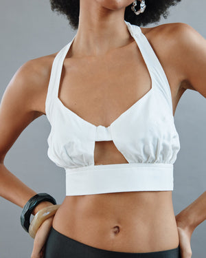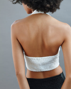 This halter neck crop top brings flirty summer energy with its front cutout and sculpted, wrapped silhouette. The open back with smocked detail keeps it comfy, breezy, and ready for sun-soaked adventures.