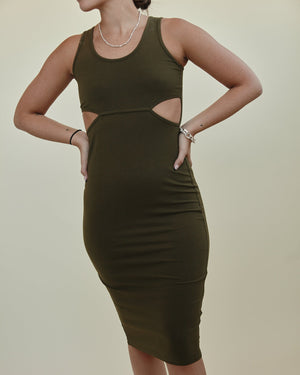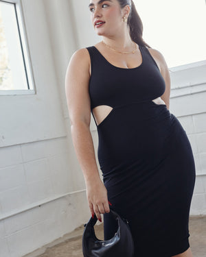 Your classic bodycon midi dress but with a cutout twist! This ribbed dress hugs your curves beautifully while the side cutouts add just the right amount of edge. Dress up with a statement necklace, and strappy heels for special occasions, or dress down with a jacket and sneakers for a casual day out.