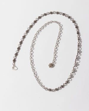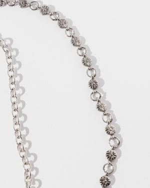 Bring a bold vintage vibe to your look with this silver-tone chain belt, detailed with flower-embossed medallions. Whether draped over jeans or cinched on a dress, it’s the perfect mix of edgy and chic!