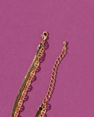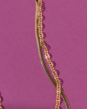 This chic layered necklace pairs a sleek herringbone strand with a classic chain for an effortlessly cool, mixed-texture look. Finished with radiant 16K gold plating, it’s the kind of everyday statement that makes any outfit feel instantly styled.