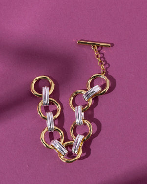 Chunky links with a cool mixed-metal glow make this bracelet an instant statement piece. Designed to shine solo or stack effortlessly, it’s bold, striking, and seriously addictive to wear.