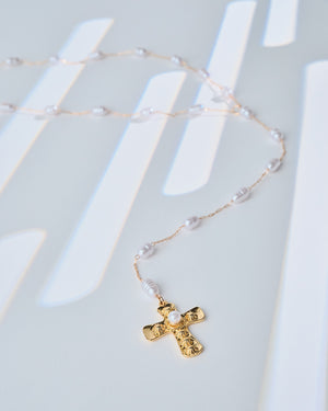 This elegant rosary-style necklace pairs luminous pearl beads with a 16K gold-plated cross charm, giving classic devotion a touch of luxe flair. It’s the perfect piece for adding a little heavenly glow to your everyday style.