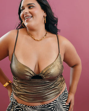 This sexy top brings instant main-character energy with its metallic sheen, ruched fit, and flirty front cutout that demands the spotlight. Throw it on and watch every room turn into your personal runway.