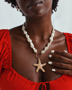 Channel oceanic elegance with this pendant necklace, where a uniquely abstract pearl steals the spotlight before flowing into a beautifully detailed starfish pendant. A dreamy piece that’s equal parts seaside charm and timeless style!