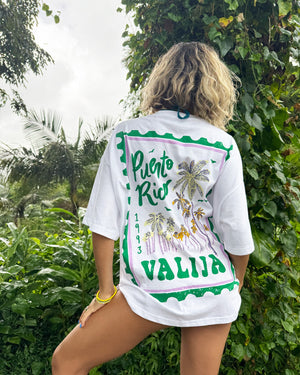 Bring island vibes to your everyday style with the Oversized Arte Top. This comfy tee features a laid-back oversized fit, drop shoulders, and a vibrant back print inspired by Puerto Rican postal stamps — complete with tropical palms and bold “Valija” lettering. A subtle embroidered palm tree on the front adds a minimalist touch. It's a wearable postcard from paradise.