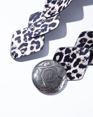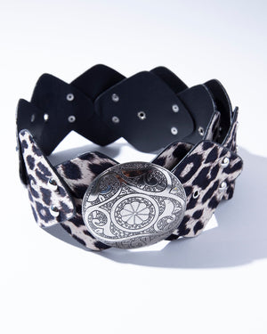 Unleash your wild side with this statement wide belt, where bold animal print meets edgy triangle patterns and eyelet details. Topped off with a stunningly designed metal buckle, it’s the perfect blend of fierce, fashion-forward, and totally untamed!