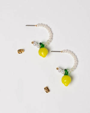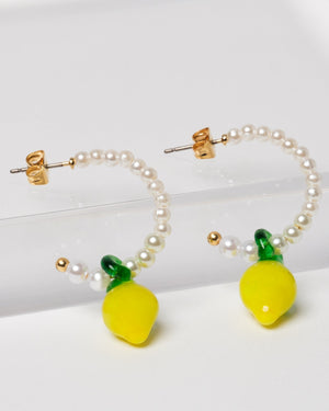 Add a touch of true zest with these adorable, lemon and pearl adorned earrings. Featuring a lemon charm dangle, these golden hoops are certain to make a statement.