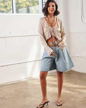 Soft, flirty, and effortlessly charming, this crop top features delicate ruffle details and a sweet tie-front design. With its flowy long sleeves and breezy silhouette, it’s the perfect piece to add a touch of romance to your everyday look.