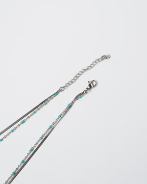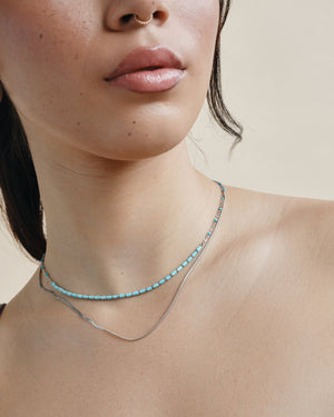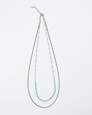 This layered necklace pairs a sleek silver snake chain with a delicate strand adorned with unique turquoise stones for an effortlessly chic, boho vibe. Perfect for adding a pop of color and earthy elegance to any outfit!