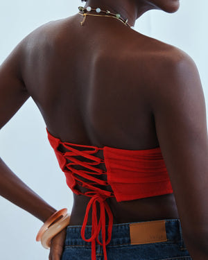 Tailored and feminine with just the right amount of structure. This strapless style features a clean front and lace-up back for an adjustable, flattering fit. The subtle stripe pattern adds texture while keeping the look refined. Pairs perfectly with high-waisted skirts or layered under oversized button-downs.