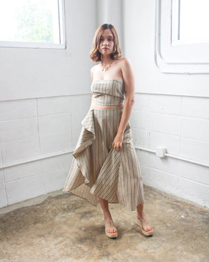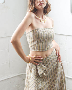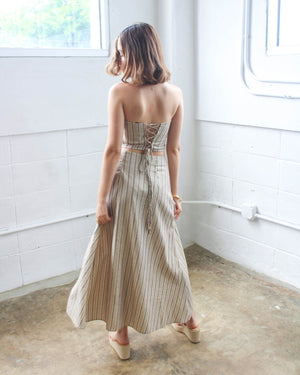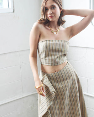 Tailored and feminine with just the right amount of structure. This strapless style features a clean front and lace-up back for an adjustable, flattering fit. The subtle stripe pattern adds texture while keeping the look refined. Pairs perfectly with high-waisted skirts or layered under oversized button-downs.