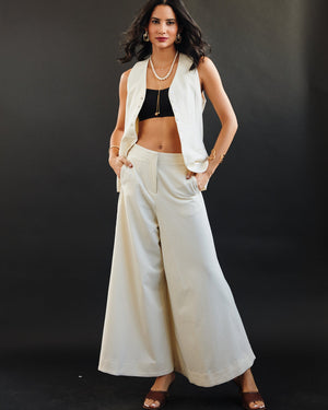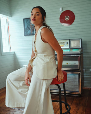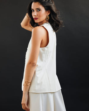 This crisp vest top brings instant polish with its tailored buttons and clean, structured lines — effortlessly chic without even trying. Pair it with anything from denim to embroidery and watch your outfit go from simple to standout in a snap.