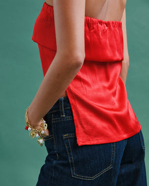 Meet your new “effortlessly glam” essential — a strapless top that drapes like a dream and shows off your shoulders with total confidence. With its chic foldover neckline and sleek side slit, this piece turns even a simple outfit into a statement moment. Dress it up with dramatic earrings or down with your favorite cargos — either way, you’re winning.