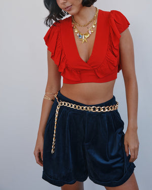This flirty crop top brings all the charm with its ruffled neckline and dreamy, romantic silhouette. The plunging front and smocked back create a perfect blend of feminine flair and effortless comfort. Whether you dress it up for brunch or wear it with denim for everyday chic, this top is an instant confidence booster.