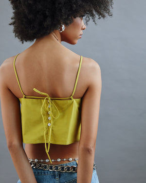 This breezy crop top keeps things sweet and simple with slim spaghetti straps and a clean square neckline. The button-back detail adds just the right touch of charm — perfect for sunny days, iced coffees, and effortless outfits.