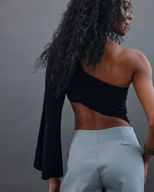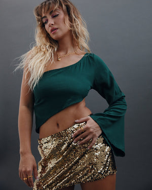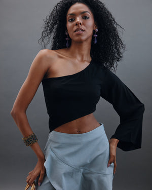 This off the shoulder beauty features a fitted bodice and a crop style. With a diagonally cut midriff and a bell sleeve, this bohemian inspired top is perfect for any occasion.