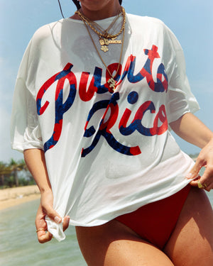 Celebrate your roots with bold style in this oversized tee, designed for effortless cool. This graphic top features a relaxed fit and drop shoulders for a laid-back silhouette. The front features an eye-catching “Puerto Rico” script that captures pride with playful energy, while the back stays minimal to let the design speak for itself. Lightweight cotton keeps it breathable and soft against the skin, whether worn dry or layered over swimwear for a nostalgic island vibe.