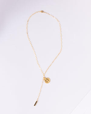 Bring a celestial touch to your jewelry box with this stunning16K gold-plated Y-necklace, featuring a beautifully detailed celestial coin and a sleek bar drop. It’s the ultimate piece that guides your look from day to night with a perfectly sophisticated glow!