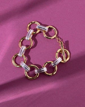 Chunky links with a cool mixed-metal glow make this bracelet an instant statement piece. Designed to shine solo or stack effortlessly, it’s bold, striking, and seriously addictive to wear.