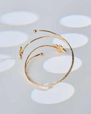 Bloom with confidence in this 16K gold-plated armband that wraps your arm in floral elegance and golden charm. Delicate yet daring, it’s the perfect piece to add a touch of goddess energy to any outfit.