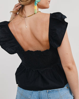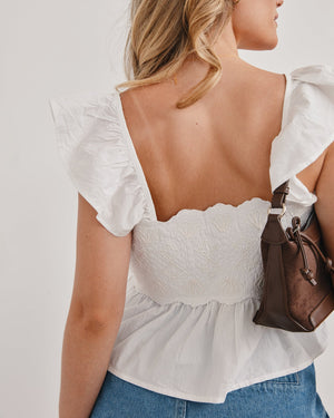 Step into sunshine with this breezy, feminine top. Designed with ruffled straps, scalloped embroidery, and a smocked back for a flexible fit, it’s both romantic and wearable. Perfect for pairing with denim, flowy skirts, or layered jewelry.