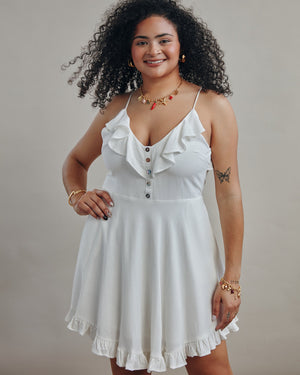 Embrace effortless bohemian charm in this patchwork mini dress, featuring a playful ruffled neckline and a flirty tiered hemline. The open back with delicate tie details makes it a standout choice for summer festivals or sun-drenched getaways.