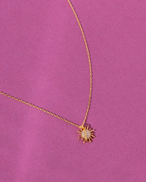 This sunburst pendant necklace shines bright with its 16K gold plating and a brilliant cubic zirconia center that sparkles like pure sunshine. Delicate yet full of personality, it’s the perfect everyday piece to light up any look.