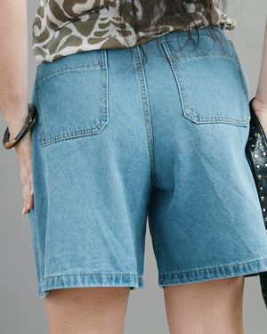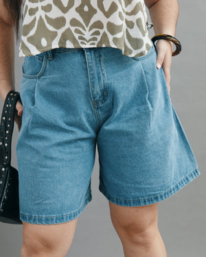 Make a bold style statement with these perfectly pleated Bermuda jeans, featuring a relaxed, wide-leg silhouette that hits just above the knee. Pair them with a metallic chain belt to take this effortless, sun-drenched look from a casual daytime stroll to an edgy evening out.