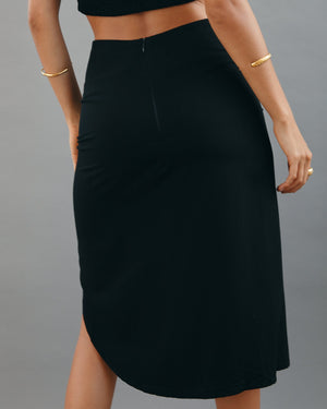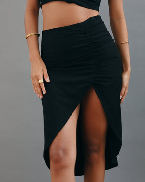 Make a sleek statement in this midi skirt, styled with a high-rise waist and ruched side for a flattering fit. A daring thigh-high slit and back zipper add the perfect balance of elegance and edge.