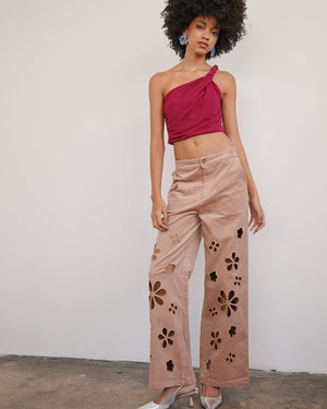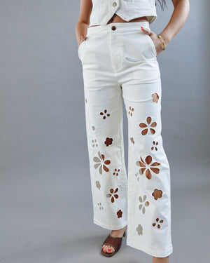 These wide-leg pants bring cool-girl edge with playful floral cutouts that flash just the right amount of skin. Bold, breezy, and full of personality — style them with a simple crop top and chunky sandals to let the pants do all the talking.