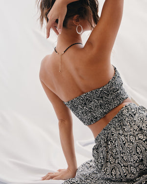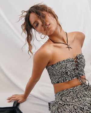 Sweet meets sassy in this strapless crop top, where delicate lace crisscrosses through eyelets for a flirty tie-front moment. The smocked back keeps things comfy while you serve major main character energy!