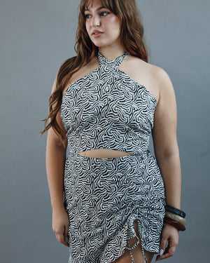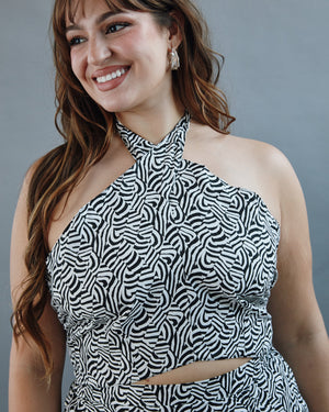 This halter-style crop top brings all the effortless cool with its sculpted neckline and flattering, curve-following cut. The open back with tie straps adds a flirty twist that makes it perfect for sunny days and breezy nights. Light, stylish, and easy to dress up or down, it’s the top that guarantees compliments wherever you go.