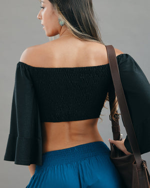 Shine with ease in this off-shoulder crop, featuring an elasticated neckline and long sleeves for a breezy fit. With a smocked back and delicate gold thread detailing, it’s the perfect mix of comfort and glam.