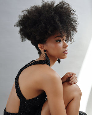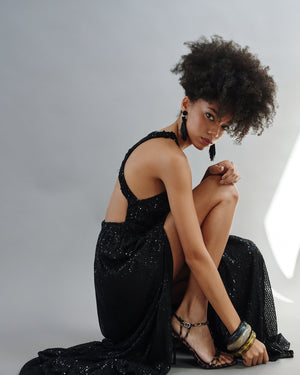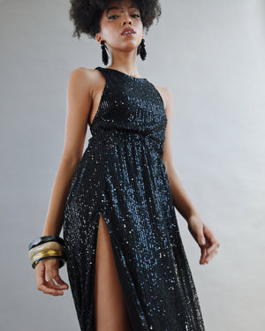 This shimmering maxi dress floats with every step, thanks to its fluid skirt and dramatic thigh-high slit. It’s an effortless showstopper — perfect for nights that deserve a little sparkle and a lot of confidence.