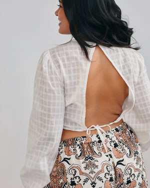 Float into fashion heaven with this dreamy crop top featuring a high neck, romantic lace trim, and dramatic balloon sleeves that say “main character energy.” The flirty keyhole open back and waist tie bring the drama, perfect for twirling into golden hour.